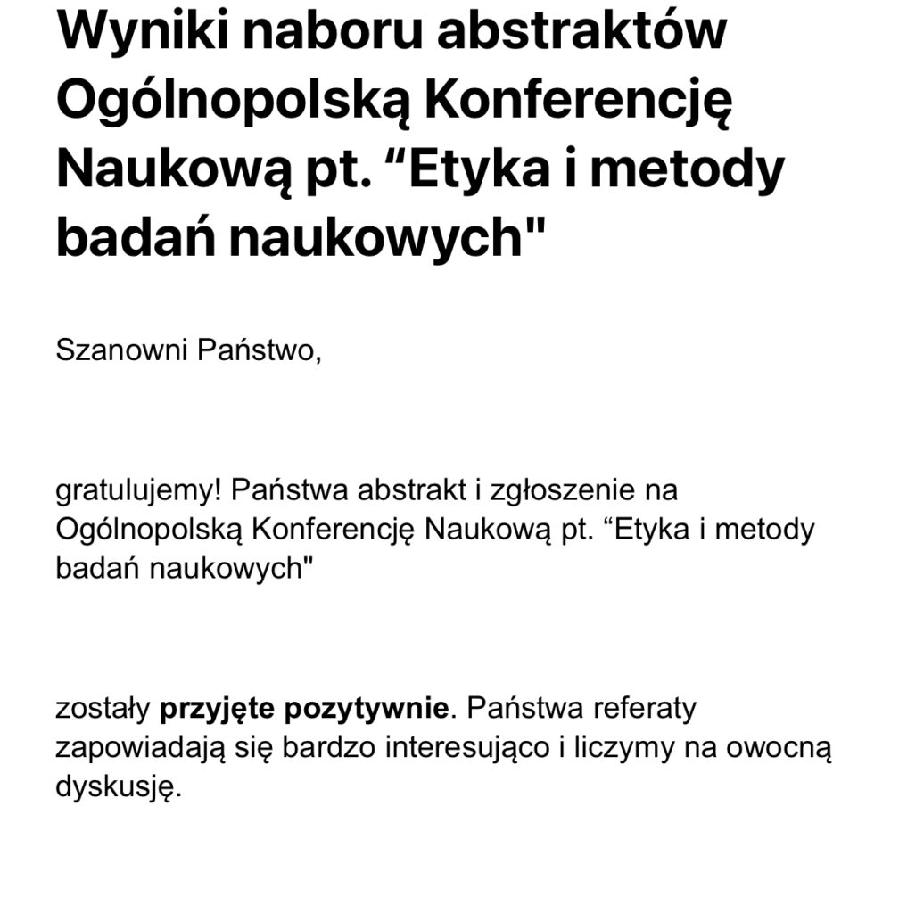 Termin nadsyłania abstraktów naukowych minął przedwczoraj. Wczoraj był termin ogłaszania tych, przyjętych. Nie otrzymałam żadnej wiadomości, więc pomyślałam: „Szkoda, będę szukała kolejnych konferencji”. Ale serio, naprawdę szkoda…